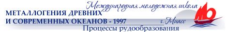 | Третья научная студенческая школа "Металлогения древних и современных океанов - 97. Процессы рудообразования" cостоялaсь 29 апреля - 5 мая 1997 г. в городе Миассе. Проведение школы и издание материалов произведено при финансовой поддержке Уральского отделения РАН, Ильменского государственного заповедника, Миасского геолого-разведочного колледжа, Отдела образования администрации г.Миасса, ФЦП "Интеграция" (проект 326.62).